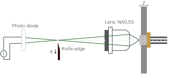 By plotting the amount of light passing through the knife edge and knife edge position (X), the integral value of the laser beam can be obtained.
