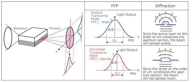 Since the resonators (active layer and stripe) within the chip comprise of up to several tens of nm in the vertical direction and several um in the horizontal direction, in general the far field pattern will be larger in the direction perpendicular to the active layer than in the horizontal direction.