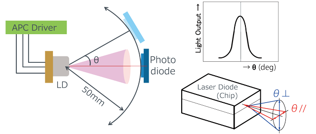 The light receiving surface of the photodiode is moved on the circumference around the light emitting point towards the light emitting surface of the laser chip, then the angle and light intensity are measured with the front as 0°.
